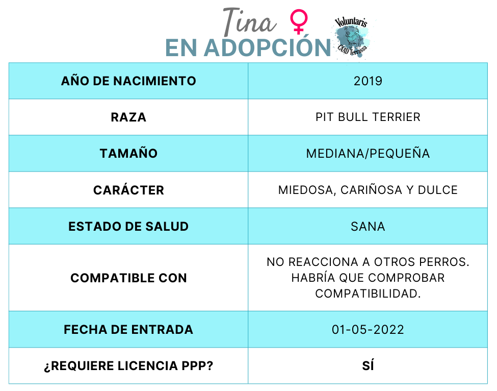 Soy Tina y quizás mi nombre viene de chiquiTINA ya que soy una de las perras más pequeñitas de tamaño que reside actualmente en el CAAD TERRASSA.