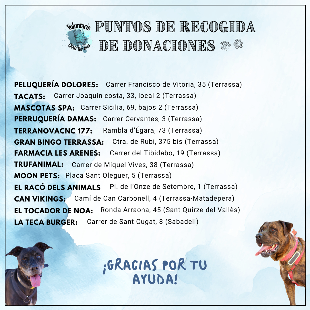 Tenemos varios puntos de recogida de material, para así poder facilitar la entrega de lo que quieras donar a los perros (ropa de abrigo, toallas, piscinas, etc.).